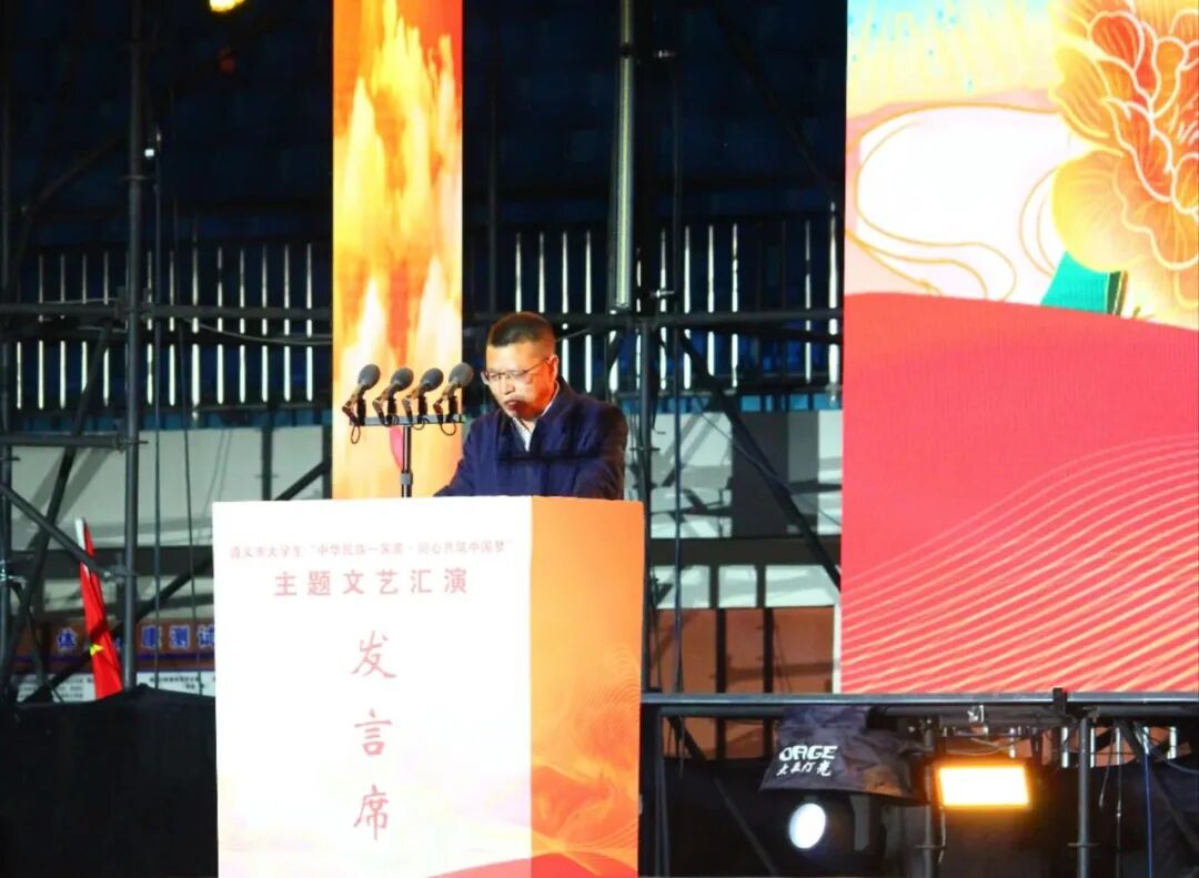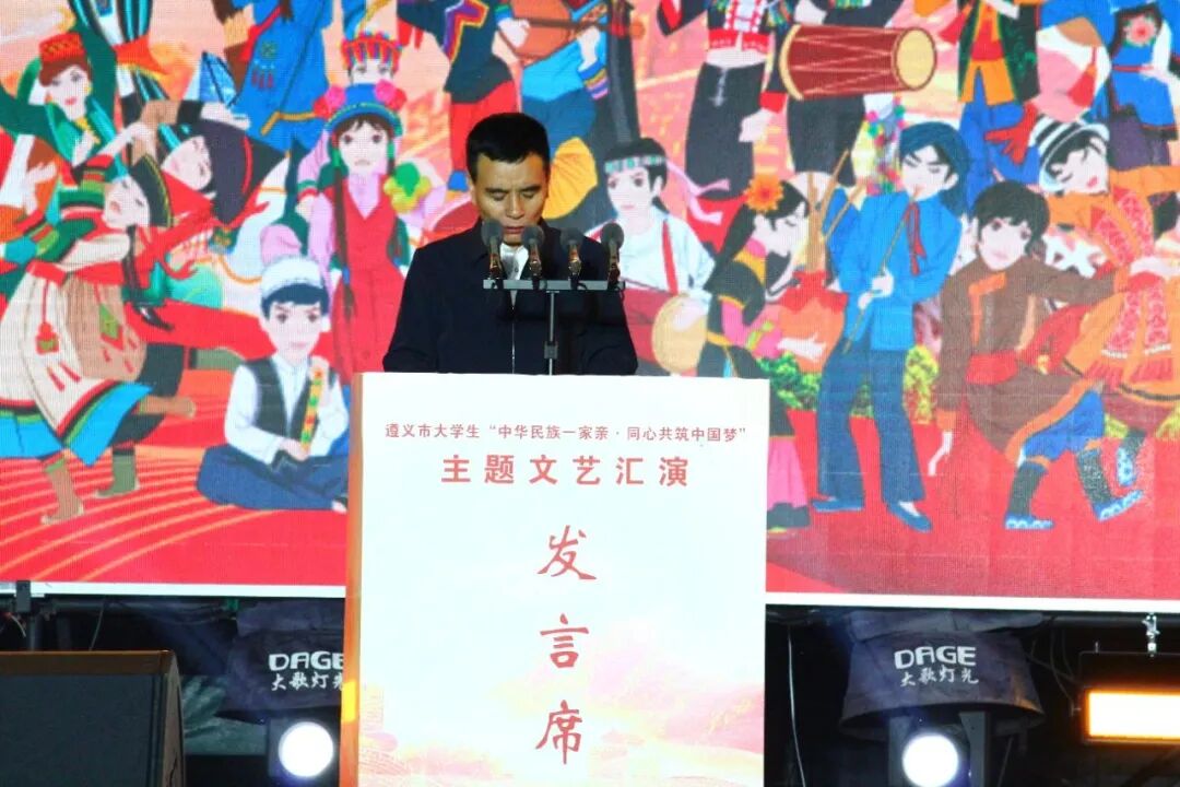 10月25日晚,由中共遵义市委统战部、遵义市民族宗教事务委员会、遵义市教育体育局、共青团遵义市委联合主办的遵义市大学生“中华民族一家亲·同心共筑中国梦”主题文艺汇演在承办单位贵州航天职业技术学院成功举办。市委统战部副部长、市民宗委主任董爱民出席并讲话,贵州航天职业技术学院党委书记冯尧致欢迎辞,团市委、市教体局相关领导、各省属驻遵及市属高校相关领导及团委书记出席活动,全市各族大学生代表3500余人观看演出。