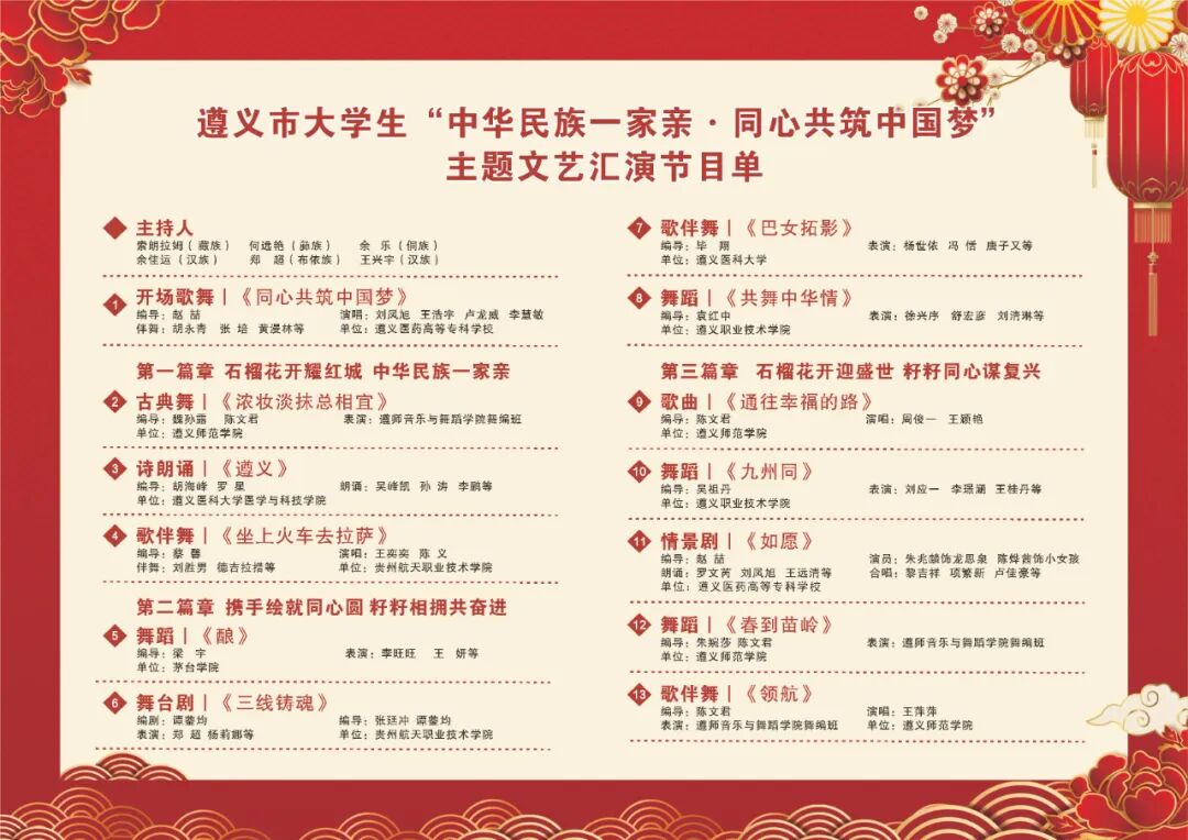 演出以演唱、舞蹈、情景剧等多种形式呈现,来自遵义医科大学、遵义师范学院、茅台学院、遵义医科大学医学与科技学院、贵州航天职业技术学院、遵义医药高等专科学校、遵义职业技术学院的表演者们,以“石榴花开耀红城 中华民族一家亲”“携手绘就同心圆 籽籽相拥共奋进”“石榴花开迎盛世 籽籽同心谋复兴”三个篇章,同台铺展全市各族群众一心向党、同心同向、逐梦复兴的生动画卷。